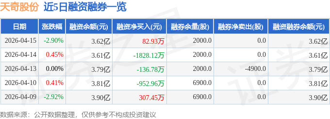 天奇股份融资融券信息显示,融资方面,当日融资买入4713.4万元,融资偿还4630.46万元,融资净买入82.93万元。融券方面,融券卖出0.0股,融券偿还0.0股,融券余量2000.0股,融券余额4.82万元。融资融券余额3.62亿元。